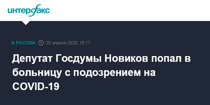 Москва. 25 апреля. INTERFAX.RU - Депутат Госдумы от КПРФ, первый зампредседателя комитета по международным делам Дмитрий Новиков госпитализирован с подозрением на коронавирус, сообщил "Интерфаксу" в субботу информированный источник во фракции.
