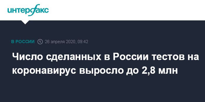 Москва. 26 апреля. INTERFAX.RU - Количество выполненных в России исследований на новую коронавирусную инфекцию выросло до 2,8 млн, сообщает в воскресенье пресс-служба Роспотребнадзора.
