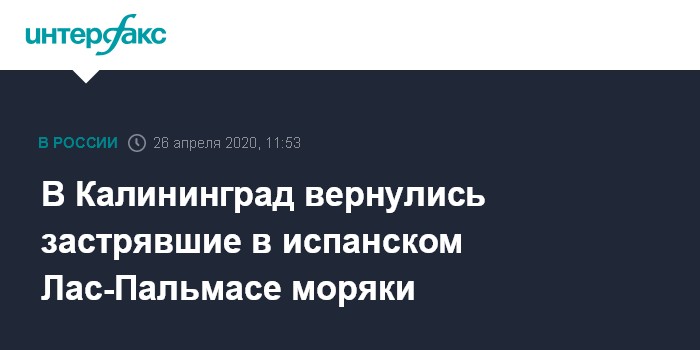 Москва. 26 апреля. INTERFAX.RU - В Калининград авиарейсом доставлены российские моряки, остававшиеся в испанском порту Лас-Пальмас из-за пандемии COVID-19, сообщили "Интерфаксу" в региональном штабе по борьбе с коронавирусом.