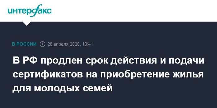 Москва. 26 апреля. INTERFAX.RU - Премьер-министр России Михаил Мишустин продлил сроки действия и подачи сертификатов на приобретение или строительство жилья для молодых семей.