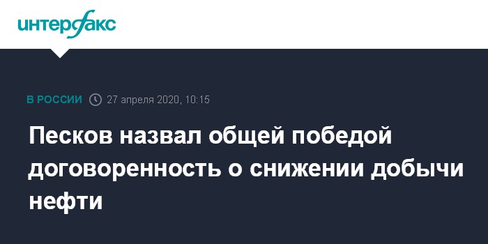 Москва. 24 апреля. INTERFAX.RU - В Кремле назвали "общей победой" последнюю договоренность РФ с Саудовской Аравией и другими нефтедобывающими странами о новом снижении объемов добычи.
