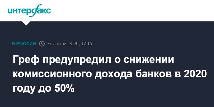 Москва. 27 апреля. INTERFAX.RU - Москва. 27 апреля. ИНТЕРФАКС - Комиссионный доход российских банков в 2020 году может снизиться на 50%, считает глава Сбербанка Герман Греф. Он сказал это в эфире телеканала "Россия 1".
