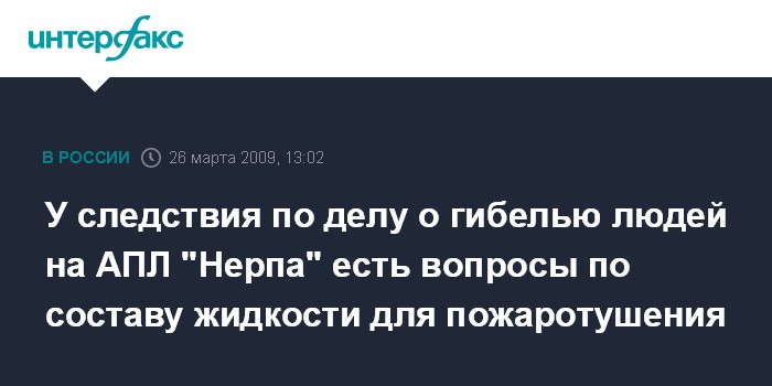 Москва. 26 марта. INTERFAX.RU - В рамках расследования гибели членов экипажа на атомной подводной лодке "Нерпа" в Японском море у Следственного комитета при прокуратуре есть вопросы к командованию и по химическому составу вещества, который используется при пожаротушении.