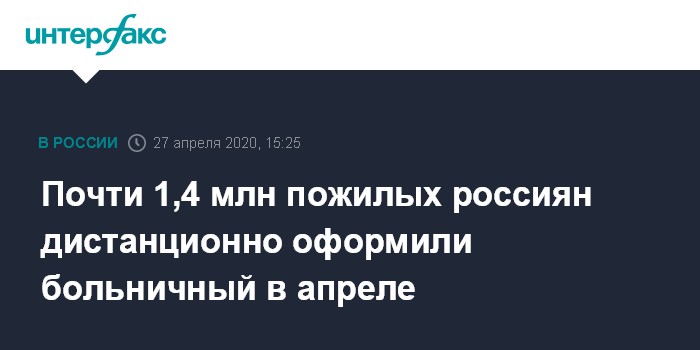 "В том числе за период с 6 по 19 апреля листок нетрудоспособности предоставлен 708 тысячам, а с 20 по 30 апреля - 687 тысячам работающих россиян в возрасте 65 лет и старше", - говорится в сообщении, поступившем в "Интерфакс" в понедельник.