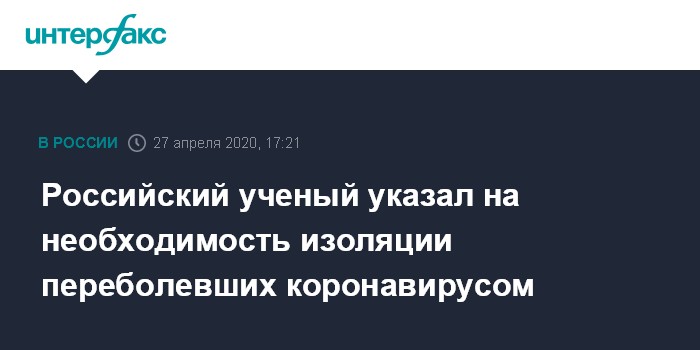 Москва. 27 апреля. INTERFAX.RU - Некоторые переболевшие коронавирусом COVID-19 до месяца продолжают выделять вирус, поэтому важно продолжать наблюдение за пациентами и помещать их после выздоровления в изоляцию, заявил заместитель директора НИИ эпидемиологии и микробиологии имени Пастера Роспотребнадзора (Петербург) Александр Семенов.