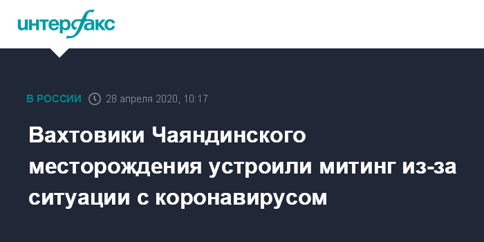 Москва. 28 апреля. INTERFAX.RU - В соцсетях появилось видео, на котором несколько сотен работников Чаяндинского месторождения в Якутии устроили несанкционированный митинг и жалуются на плохие условия в поселке, где объявлен карантин из-за коронавируса.