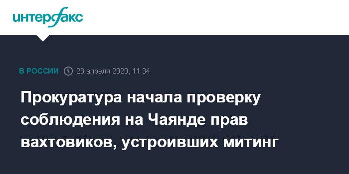 Москва. 28 апреля. INTERFAX.RU - Прокуратура Ленского района Якутии начала проверку соблюдения прав вахтовых рабочих Чаяндинского нефтегазоконденсатного месторождения ОАО "Газпром добыча Ноябрьск" в условиях распространения коронавирусной инфекции, говорится в сообщении прокуратуры Якутии.