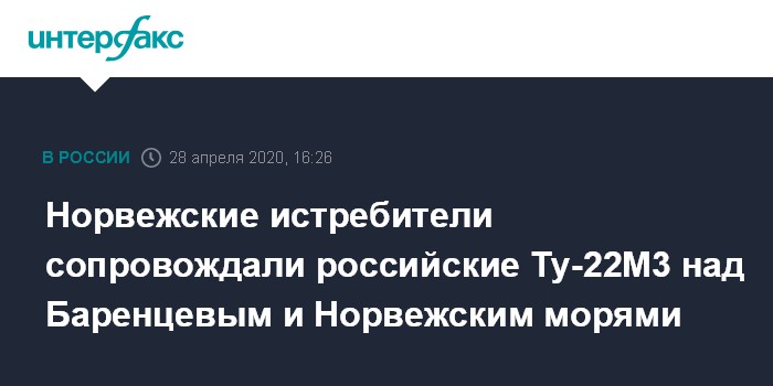Москва. 28 апреля. INTERFAX.RU - Российские дальние бомбардировщики Ту-22М3 во вторник совершили четырехчасовой полет над Баренцевым и Норвежским морями, Норвегия поднимала истребители на сопровождение, сообщили в Минобороны РФ.