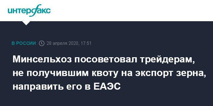 Москва. 28 апреля. INTERFAX.RU - Трейдеры, которые закупили зерно, но не успели получить квоту на его экспорт из России, могут перенаправить его на внутренний рынок или на рынки стран ЕАЭС, считают в Минсельхозе РФ.