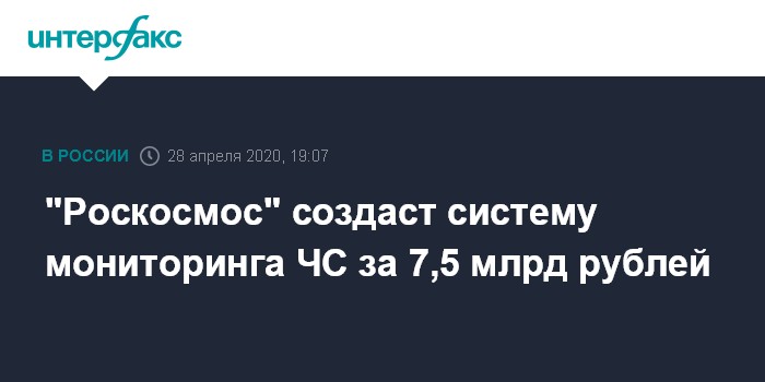 Москва. 28 апреля. INTERFAX.RU - "Роскосмос" выделил 7,5 млрд рублей на создание космической системы мониторинга чрезвычайных ситуаций, следует из материалов портала госзакупок.