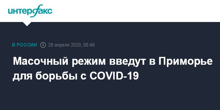 "С 30 апреля на территории Приморья вводится всеобщий масочный режим с обязательным ношением средств индивидуальной защиты", - сообщила в среду пресс-служба правительства Приморья.