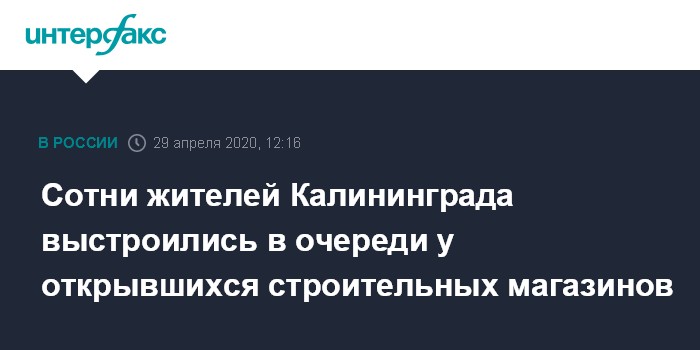 Москва. 29 апреля. INTERFAX.RU - Сотни покупателей устремились в открывшиеся после долгого перерыва строительные магазины в Калининграде, сообщили "Интерфаксу" в торговых сетях.