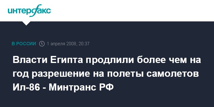 Москва. 1 апреля. ИНТЕРФАКС - Авиавласти Египта продлили более чем на год разрешение на полеты в эту страну российских самолетов Ил-86, заявил "Интерфаксу" официальный представитель Минтранса РФ.