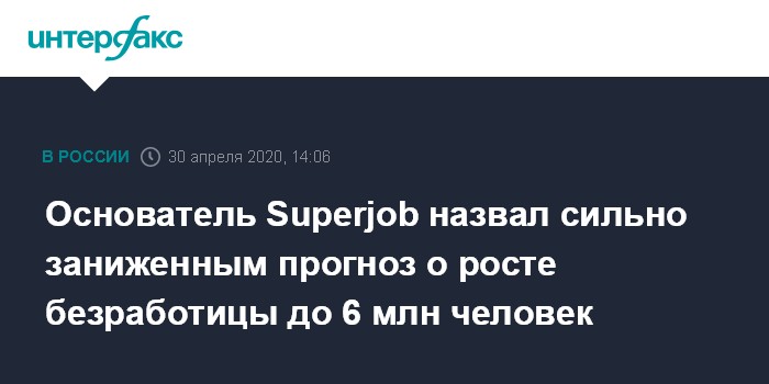 Москва. 30 апреля. INTERFAX.RU - После пандемии Россию ждет самая большая безработица с начала 90-х годов, прогноз Минтруда о росте числа безработных до 6 млн человек занижен в пять-шесть раз, считает основатель сервиса по поиску работы Superjob.ru Алексей Захаров.