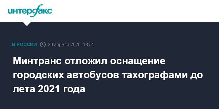 Москва. 30 апреля. INTERFAX.RU - Минтранс подготовил проект постановления правительства о том, чтобы перенести до лета 2021 года срока оснащения городских автобусов тахографами, сообщила пресс-служба ведомства.