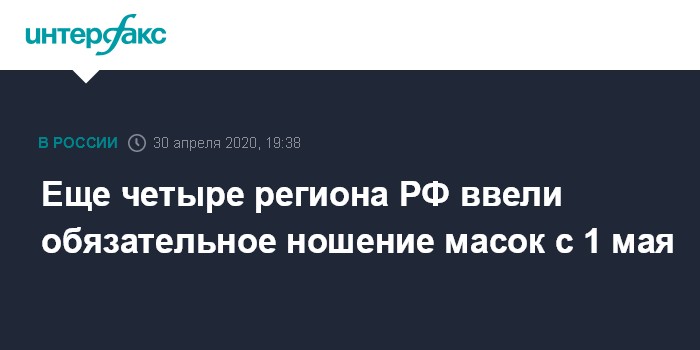 Москва. 30 апреля. INTERFAX.RU - Власти Вологодской, Ростовской и Новгородской областей, а также республики Коми вводят с 1 мая обязательное ношение масок в общественных местах.