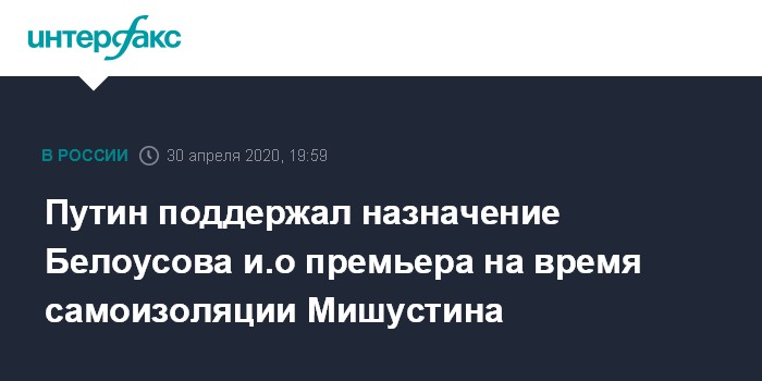 Москва. 30 апреля. INTERFAX.RU - Президент России Владимир Путин поддержал предложение возложить обязанности главы правительства на первого вице-премьера Андрея Белоусова на время нахождения премьера Михаила Мишустина на самоизоляции и пообещал подписать соответствующий указ в четверг.