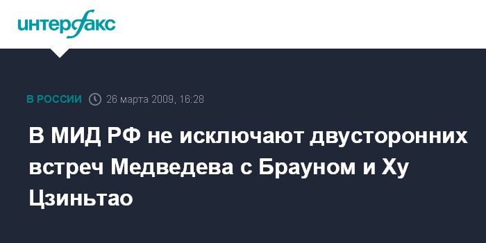 Москва. 26 марта. INTERFAX.RU - Официальный представитель МИД РФ Андрей Нестеренко не исключает, что в рамках саммита "большой двадцатки" в Лондоне на следующей неделе состоятся двусторонние встречи президента России Дмитрия Медведева с премьер-министром Великобритании Гордоном Брауном и лидером КНР Ху Цзиньтао.