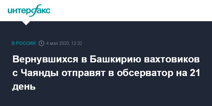 Москва. 4 мая. INTERFAX.RU - Рабочие Чаяндинского нефтегазоконденсатного месторождения, вернувшиеся в Башкирию, проведут в обсерваторе 21 день, сообщил глава республики Радий Хабиров на совещании правительства региона в понедельник.