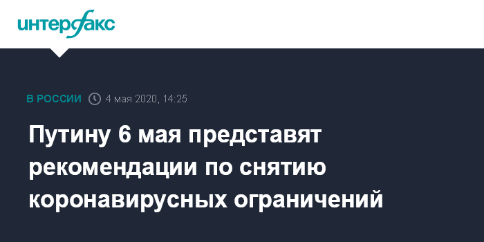 Ранее президент заявил, что ждет к 6 мая от правительства доклады о том, как реализуются меры поддержки граждан и предпринимателей в условиях борьбы с коронавирусом. Он также напомнил, что к 5 мая правительство и Роспотребнадзор в контакте с рабочей группой Госсовета должны внести рекомендации по поэтапному выходу после майских праздников из режимов санитарных ограничений.