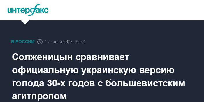 Москва. 1 апреля. ИНТЕРФАКС - Русский писатель, лауреат Нобелевской премии Александр Солженицын осудил попытки нынешних украинских политиков убедить мировое сообщество в том, что голод 30-х годов, именуемый "голодомором", был геноцидом, направленным только против украинской нации.