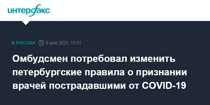 Москва. 6 мая. INTERFAX.RU - Уполномоченный по правам человека в Санкт-Петербурге Александр Шишлов призвал скорректировать порядок признания пострадавшими медиков, заразившихся коронавирусом, поскольку он допускает конфликт интересов. Об этом сообщил аппарат омбудсмена.