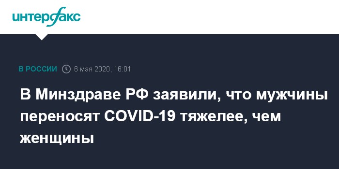Москва. 6 мая. INTERFAX.RU - Мужчины переносят заболевание коронавирусом хуже, чем женщины; тяжелая форма течения болезни чаще наблюдается у пожилых и пациентов, страдающих хроническими заболеваниями, сообщил глава Минздрава РФ Михаил Мурашко.