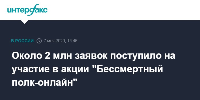 Москва. 7 мая. INTERFAX.RU - Заявки на участие во всероссийской акции памяти ветеранов Великой Отечественной войны "Бессмертный полк", которая в этом году пройдет онлайн в виде виртуального шествия, подали около 2 млн человек, сообщил сопредседатель центрального штаба Общероссийского общественного движения "Бессмертный полк России" Сергей Макаров.
