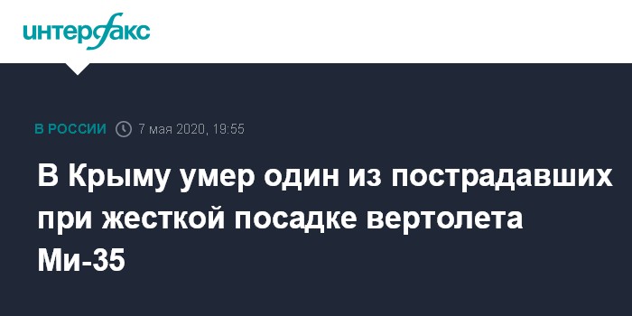 Москва. 7 мая. INTERFAX.RU - Один военный, получивший травмы при жесткой посадке вертолета Ми-35 в Крыму, скончался. Об этом сообщил агентству "Интерфакс" информированный источник в четверг.