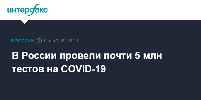 Москва. 8 мая. INTERFAX.RU - Число выполненных в России тестов на коронавирусную инфекцию превысило 4,9 млн, сообщает Роспотребнадзор.
