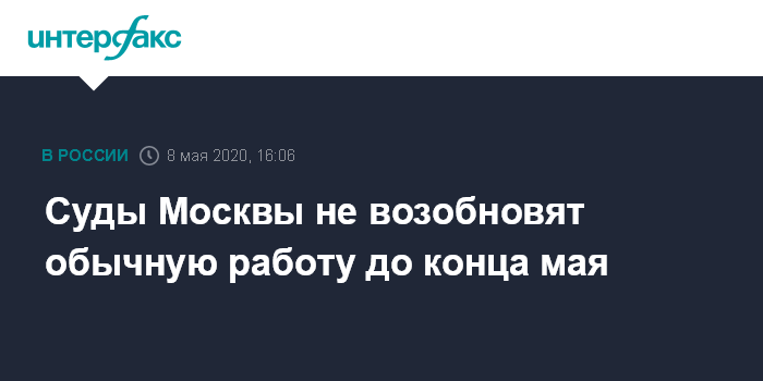 Москва. 8 мая. INTERFAX.RU - Московские суды до конца мая не возобновят работу в полном объеме, сообщила пресс-секретарь Мосгорсуда Ульяна Солопова. Ранее в этот день судебный департамент при Верховном суде разрешил судам вернуться к нормальному режиму работы с 12 мая в зависимости от ситуации в регионе.