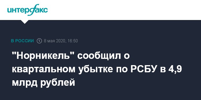 Москва. 8 мая. INTERFAX.RU - В I квартале 2020 года "Норникель" получил чистый убыток по РСБУ в 4,915 млрд рублей против чистой прибыли годом ранее.