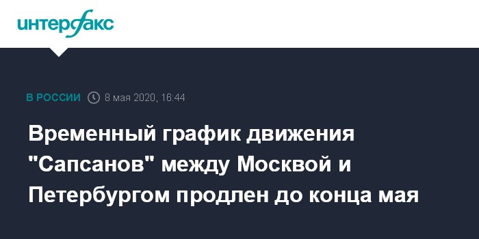 Москва. 8 мая. INTERFAX.RU - ОАО "Российские железные дороги" (РЖД) продлевает до 28 мая временный график движения поездов "Сапсан" между Москвой и Петербургом, сообщили РЖД. Это связано со снижением спроса на поездки между этими городами на фоне неблагоприятной эпидемиологической ситуации.