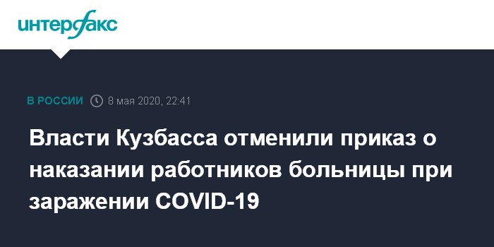 Москва. 8 мая. INTERFAX.RU - Минздрав Кузбасса отменил приказ главврача Кемеровской областной больницы, согласно которому сотрудник медучреждения, зараженный коронавирусом, мог быть уволен или оштрафован, сообщает пресс-служба министерства в пятницу.
