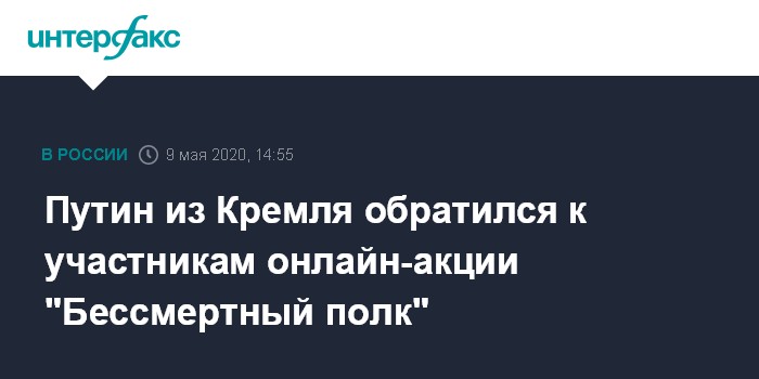 Москва. 9 мая. INTERFAX.RU - Президент России Владимир Путин в День Победы, как и обещал, присоединился к участникам акции "Бессмертный полк", которая в этом году из-за эпидемии коронавируса проходит в онлайн-режиме.