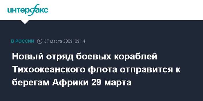 Москва. 27 марта. INTERFAX.RU - Из Владивостока отряд боевых кораблей Тихоокеанского флота (ТОФ) в составе большого противолодочного корабля (БПК) "Адмирал Пантелеев", танкеров "Ижора" и "Иркут", а также морского буксира МК-37 29 марта отправится в район Африканского Рога, где приступит к патрулированию для защиты морских судов от пиратских нападений.