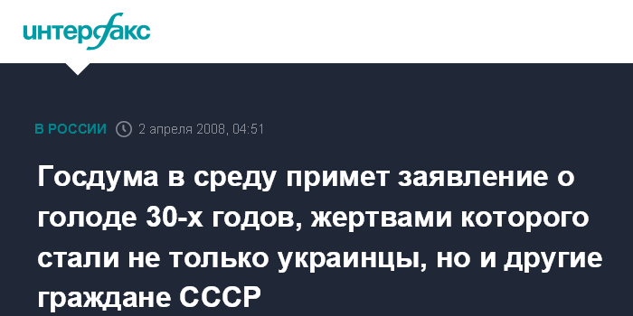 Он сообщил, что эта позиция будет выражена в специальном заявлении Госдумы, посвященном памяти жертв голода 30-х годов в Советском Союзе.