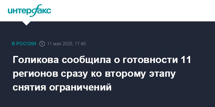 Москва. 11 мая. INTERFAX.RU - Одиннадцать российских регионов уже готовы к первому и даже второму этапам снятия противокоронавирусных ограничений, еще 22 смогут соответствовать критериям выхода, если нарастят коечный фонд и увеличат масштабы тестирования, заявила вице-премьер РФ Татьяна Голикова.