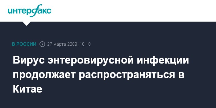 Москва. 27 марта. INTERFAX.RU - С начала 2009 г. в Китае от энтеровирусной инфекции скончались 18 детей, и вирус продолжает распространяться по стране, сообщает газета "Чайна дейли" со ссылкой на заявление министерства здравоохранения КНР, опубликованное в пятницу.