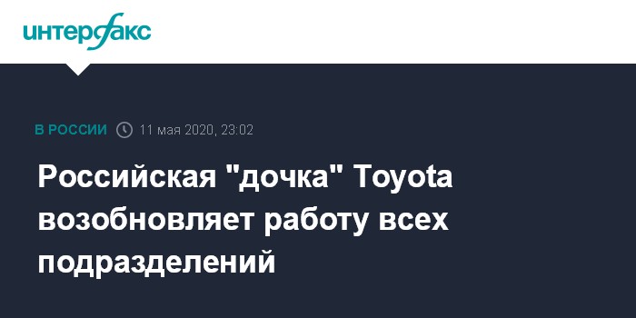 Москва. 11 мая. INTERFAX.RU - Российское подразделение Toyota - ООО "Тойота мотор" - с 12 мая возобновляет работу всех подразделений, включая производство в Петербурге, сообщили "Интерфаксу" в компании.