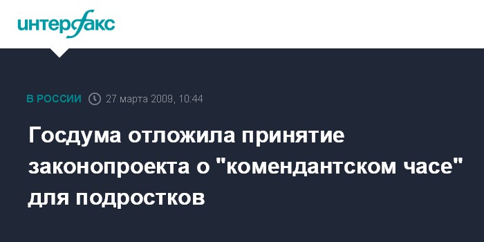 Москва. 27 марта. INTERFAX.RU - Госдума РФ в пятницу отложила третье, окончательное чтение закона, предусматривающего возможность устанавливать так называемый "комендантский час" для детей и подростков.