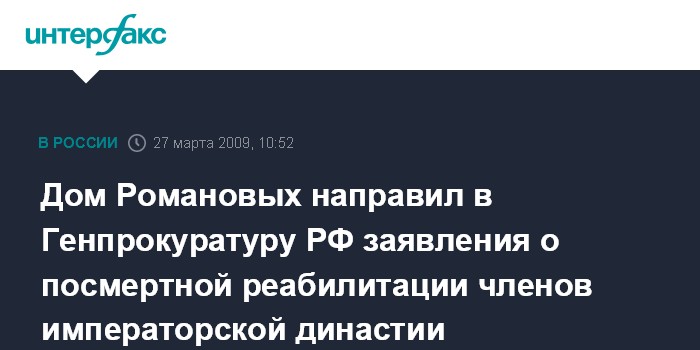 Москва. 27 марта. INTERFAX.RU - Императорский дом Романовых в пятницу обратился в Генпрокуратуру РФ с заявлением о реабилитации членов императорской фамилии - великих князей и князей, которые были казнены большевиками после революции.