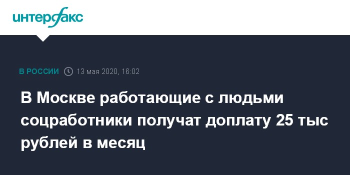 Москва. 13 мая. INTERFAX.RU - В ближайшие дни будет принято решение о дополнительных выплатах в Москве социальных работников, непосредственно работающих с людьми, сообщил мэр Москвы Сергей Собянин на встрече с социальными работниками и волонтерами. Для этой категории соцработников предусмотрены выплаты в размере 25 тысяч.