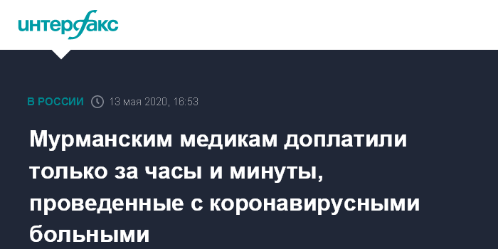 Москва. 13 мая. INTERFAX.RU - В Мурманской области медикам по ошибке при начислении стимулирующих выплат за работу с больными COVID-19 учитывали только часы и минуты, проведенные непосредственно с пациентом, сообщил глава регионального Минздрава Дмитрий Панычев.
