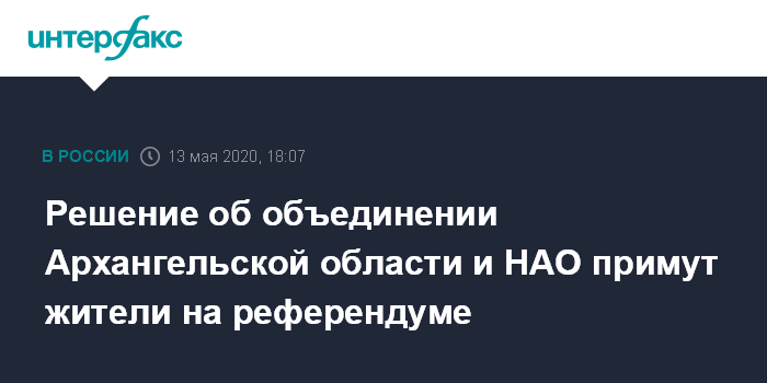 Москва. 13 мая. INTERFAX.RU - Принимать окончательное решение о слиянии Архангельской области и Ненецкого автономного округа (НАО) в единый регион предстоит жителям на референдуме. Об этом сообщили "Интерфаксу" в пресс-службе правительства Поморья в среду со ссылкой на врио главы региона Александра Цыбульского.