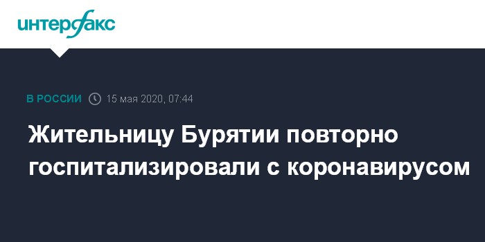 Москва. 15 мая. INTERFAX.RU - Жительница Бурятии повторно госпитализирована с коронавирусом, сообщила главный врач республиканской инфекционной больницы Татьяна Сымбелова.