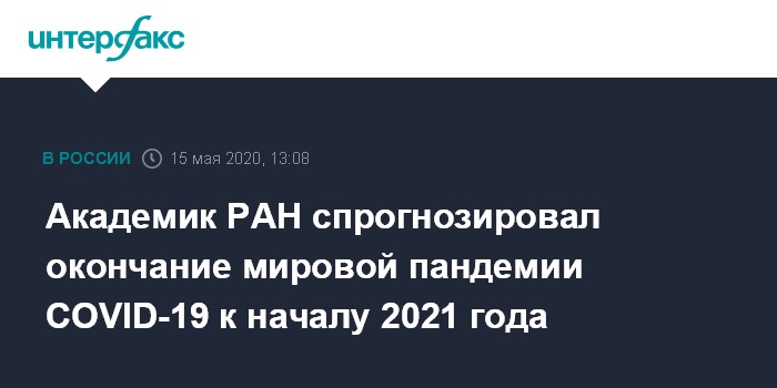 Москва. 15 мая. INTERFAX.RU - Пандемия новой коронавирусной инфекции в мире может закончиться к январю 2021 года, заявил президент Российского научного общества иммунологов, научный руководитель Института иммунологии и физиологии УрО РАН, академик РАН Валерий Черешнев.