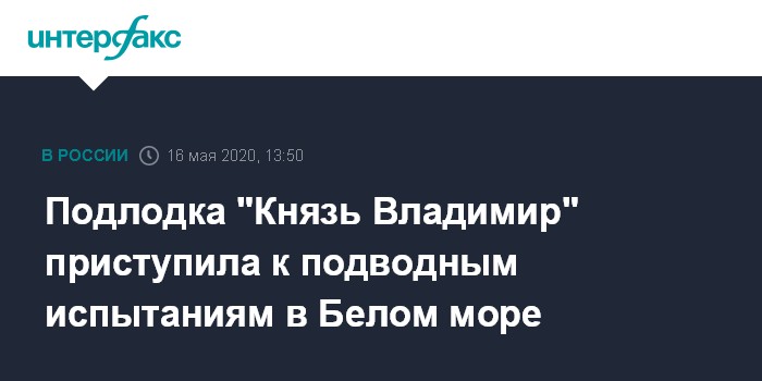 Москва. 16 мая. INTERFAX.RU - Ракетный подводный крейсер стратегического назначения "Князь Владимир" приступил к подводным испытаниям в Белом море, сообщили в субботу в пресс-службе Северного флота.