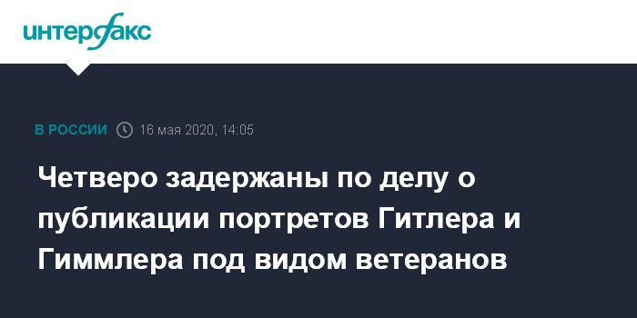 Москва. 16 мая. INTERFAX.RU - Задержаны четверо фигурантов дела о размещении в интернете портретов лидеров нацистской Германии под видом советских воинов, сообщила "Интерфаксу" в субботу официальный представитель Следственного комитета России (СКР) Светлана Петренко.