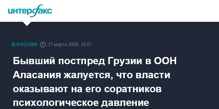 Москва. 27 марта. INTERFAX.RU - Лидер оппозиционного "Альянса за Грузию", бывший постпред Грузии в ООН Ираклий Аласания заявил, что на его однопартийцев со стороны правоохранительных органов оказывается психологическое давление.